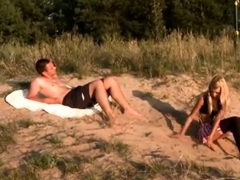 Girl Jerks Off guy dick on public beach and he cums on plaid
